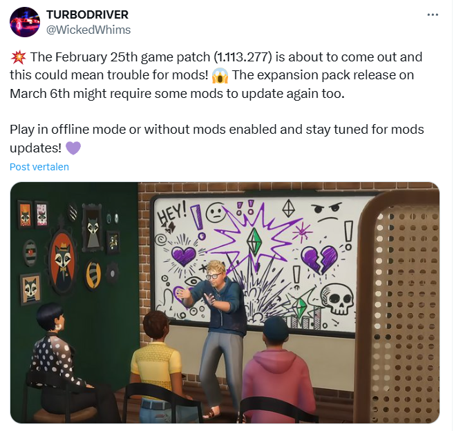 Volgens de laatste Sims 4 Roadmap staat voor morgen, 25 februari, de laatste verrassing voor The Sims 25 jaar gepland. De Roadmap geeft alleen een paar ogen weer en voor de rest is het nog gissen wat dit betekent! Maar de bekende modder Turbodriver (@Wickedwhims) heeft vandaag al een bericht op X gedeeld waarin hij aangeeft dat er een update gepland staat voor morgen. Ook de waslijst van 18 februari zal hierin worden meegenomen.