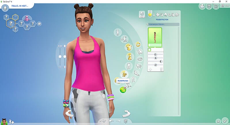 Zo is het mogelijk om bij Lichaam > Accessoires de nieuwe optie 'Huideffecten' te gebruiken.. Dit geeft je Sim op een aantal plaatsen op het lichaam een glanzend effect alsof er een lamp op gericht staat. Met de schuifregelaars kan je de kleur e.d. aanpassen.