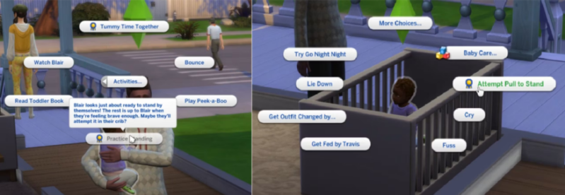 - [EA Forums] We’ve addressed an issue where it was difficult to unlock the Pull to Stand Milestone. The problem is that Infants need to be near certain specific objects to pull themselves up for the first time, but this is never indicated to the player and sometimes infants aren’t located near these objects. They can still unlock this Milestone as they could previously, but to address the concerns with this not being obvious in many cases, we’ve added a greyed out interaction and hovertip that directs the player to place the Infant in the Crib. While in the crib, the Infant can pull themselves to a stand, and (as an additional option) we’ve added a new interaction to Infant Sims in the crib to pull themselves up once they are ready to unlock the Milestone. This interaction is available on the Infant Sim when the Infant is the Active Sim.