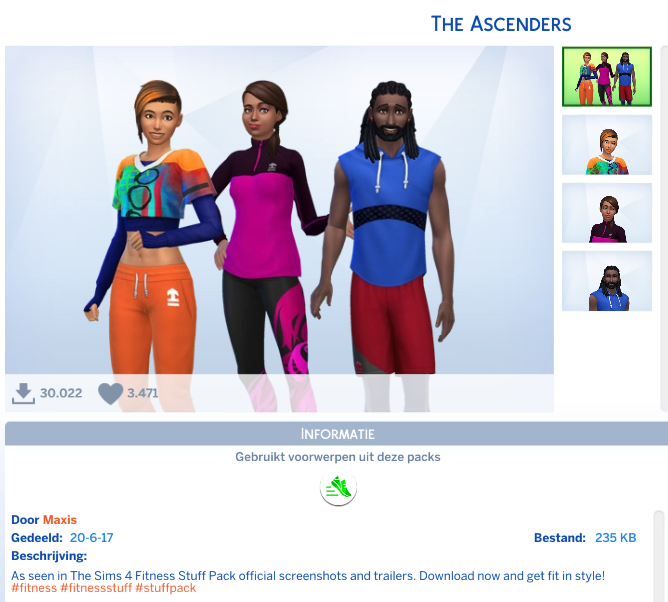 De kleding in dit pakket heeft natuurlijk een sportieve uitstraling en alle outfits zien er mooi en kleurrijk uit. Ze hebben veel details zoals ritsen, versieringen met veters en allerlei patroontjes. Er zijn verschillende 'hoodies' toegevoegd die je ook prima kunt combineren met gewone kleding. Dit pakket bevat alleen kleding voor tieners, (jong)volwassenen en ouderen maar ze zien er allemaal leuk en vrolijk uit en zorgen voor een prima aanvulling van de kledingkast van je Sims.
