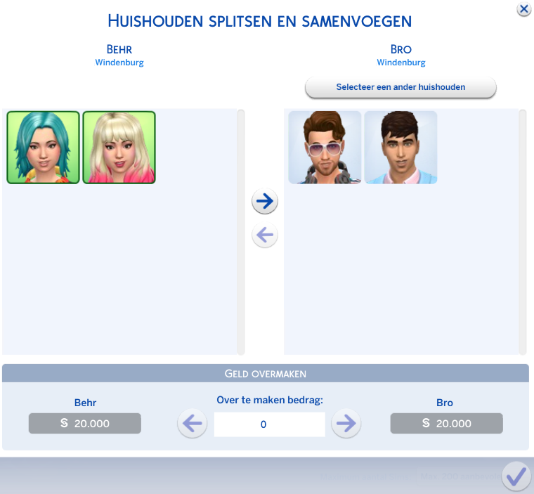Klik vervolgens links op alle Sim(s) die je wilt samenvoegen met rechts. Klik dan op het pijltje (in het midden) wat naar rechts wijst (je kunt ook Sim(s) uit het rechter huishouden samenvoegen met het linker, door het pijltje naar links te kiezen). Zodra je alle Sims van een huishouden samenvoegt met het andere huishouden, wordt automatisch het hele huishoudkapitaal overgezet naar het nieuwe huishouden. Als je een enkele Sim samenvoegt (dus als er nog nog Sim(s) achterblijven in het oude huishouden), dan kan je eerst zelf onderin het bedrag invullen wat die Sim meeneemt naar het nieuwe huishouden.