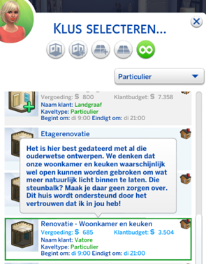 Zodra je aan de carrière begonnen bent, vind je rechtsonder in het carrièrepaneel het icoontje Klussen zoeken. Je bent vrij om te bepalen hoe vaak en wanneer je wilt werken.
