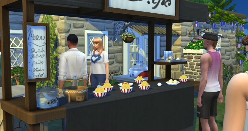 - De Gelati Popcornpoffer: neem de popcornpoffer mee in de inventaris van je Sim en plaats hem op het kraampje. Na bereiding van de popcorn (meerdere smaken mogelijk) haal je het apparaat leeg en vind je het terug in de inventaris van je Sim. Klik op het kraampje en kies Open. Je kunt nu de popcorn van de inventaris van je Sim slepen naar de inventaris van het kraampje. Na het starten van de verkoop zal het op de tafel worden geplaatst zodra er ruimte voor is.