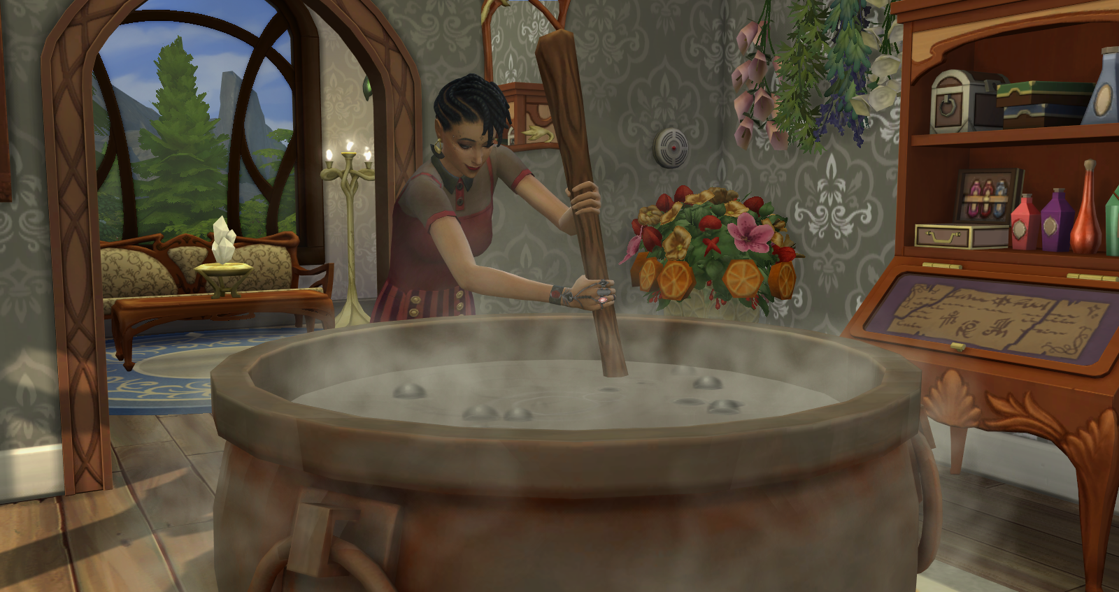 Als je het ToverSim-voordeel Roerarm hebt gekocht, gaat niet alleen het maken van drankjes sneller, maar kan je Sim vanaf de rang Deskundige ook in de ketel roeren met behulp van een toverstaf.
