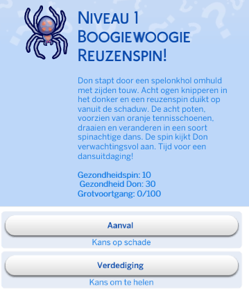 Het is dus heel belangrijk dat je Sim goed is uitgerust en aan alle behoeftes zijn voldaan. Bij sommige opdrachten kan je zien wat de gezondheid van je Sim op dat moment is en wat de gezondheid van bijvoorbeeld de reuzenspin is. Als jouw Sims' gezondheid beter is, is de kans dat de opdracht slaagt groter.