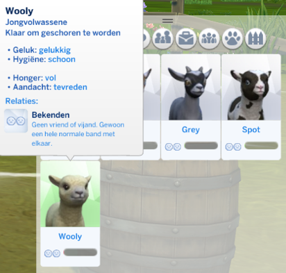 Ook is het niet mogelijk om dit in te stellen tussen een paard/veulen en een hond/kat. Paarden/veulens en honden/katten zien elkaar als huishoudlid en elke Sim als 'baasje'. Je kunt wel de familierelatie én de familiedynamiek tussen paarden onderling instellen.
