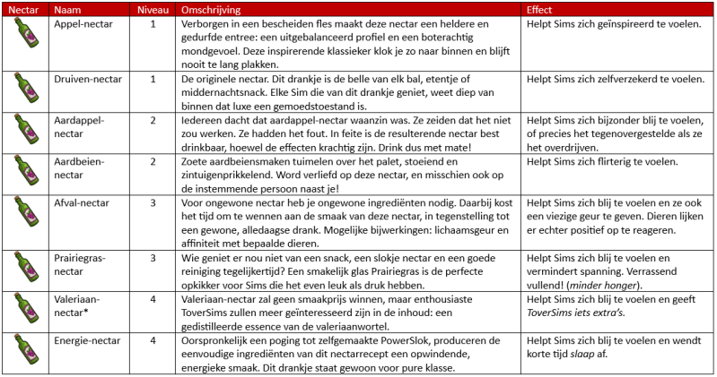 Nieuwe informatie over elk type nectar wordt hier toegevoegd OF wacht af om te zien wat er gebeurt als je Sim het drinkt!