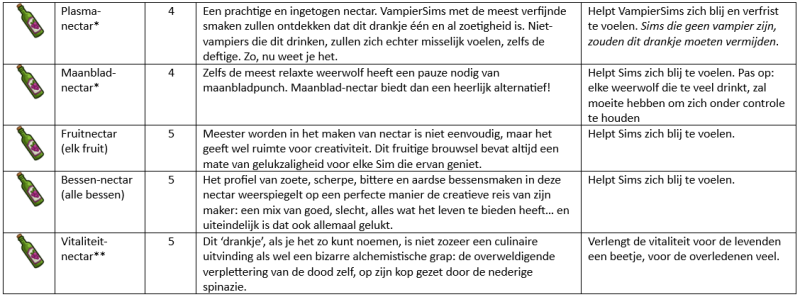 * Het recept voor Maanblad-nectar, Plasma-nectar en Valeriaan-nectar kan je Sim ontgrendelen door deze nectar aan een bar te bestellen.