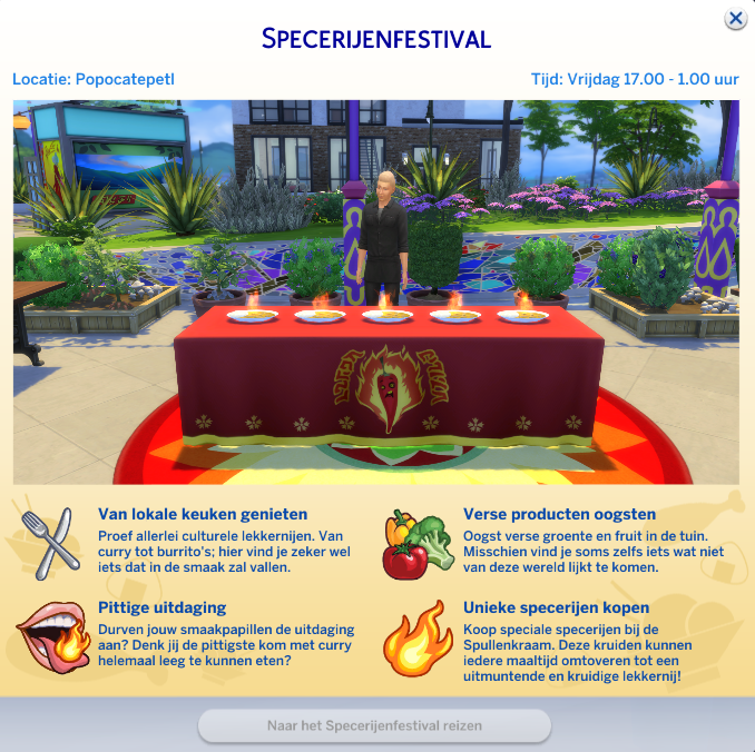 Ontdek levendige culturele festivals. Festivals vormen een geweldige kans om je horizon te verbreden. Laat je Sims straatartiesten bewonderen, meedoen aan wedstrijden en kennismaken met personen uit alle lagen van de samenleving. Bekijk de Curry Uitdaging op het Specerijenfestival of steek vuurwerk aan met een spannend afspraakje op het Liefdesfestival.