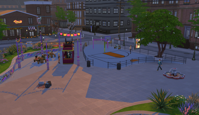 Op alle pleinen is de mogelijkheid voor je Sim om op te treden als straatmuzikant (vanaf vaardigheidsniveau 4) en er zijn levende standbeelden te bekijken.